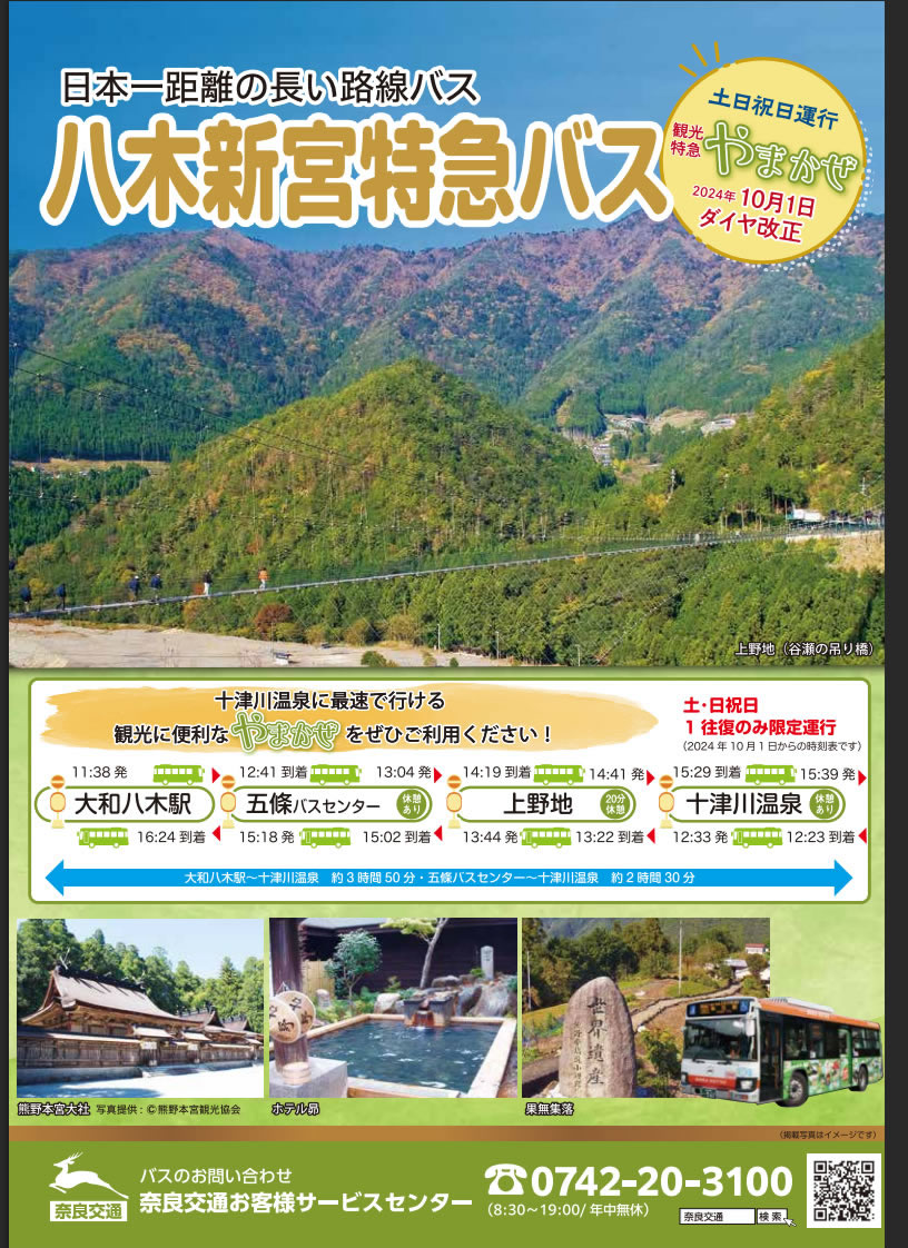 八木新宮特急バスは全長169.9㎞、停留所の数168、日本一の走行距離を誇る路線バスです。